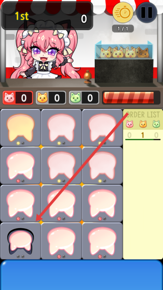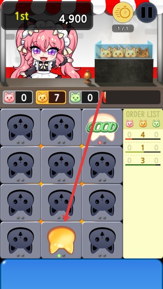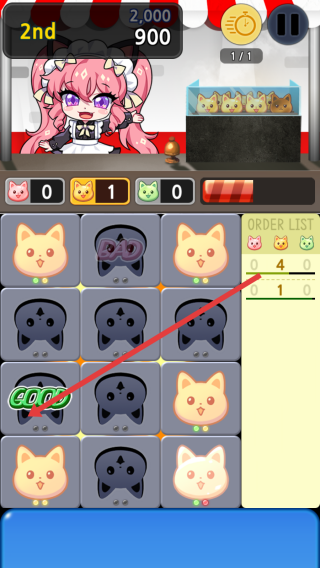 1、觀察右側(cè)ORDER LIST的訂單如貓咪的種類、數(shù)量,點(diǎn)擊下方對(duì)應(yīng)貓咪放置到空格,完成匹配。