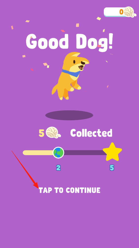 3、Good Dog字樣出現(xiàn)說明完成目標(biāo),5Collected表示這次收獲了5個物品,進度條顯示你已解鎖2個區(qū)域,5顆星星可以兌換新裝扮,點Tap to Continue繼續(xù)冒險吧。