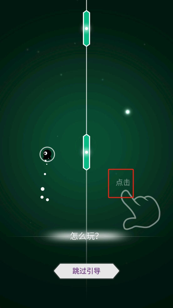 1、在引導(dǎo)界面,按照提示,當(dāng)看到紅框區(qū)域出現(xiàn)點(diǎn)擊指引時(shí),及時(shí)點(diǎn)擊該區(qū)域,控制黑色小球進(jìn)行移動(dòng)。