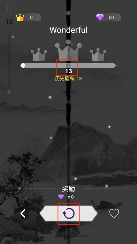 3、關(guān)卡結(jié)束后,若想重新挑戰(zhàn)刷新分?jǐn)?shù),點(diǎn)擊紅框內(nèi)的紫色重玩按鈕,再次嘗試突破歷史最高紀(jì)錄。
