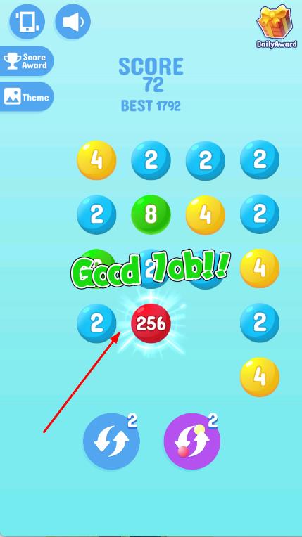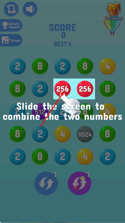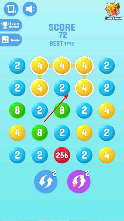 2、通過滑動(dòng)操作,將相同數(shù)字的球體連接在一起進(jìn)行合并,合并后數(shù)字會(huì)翻倍,不斷合并數(shù)字,使數(shù)字不斷增大。