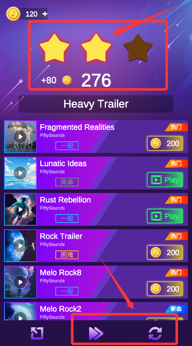 4、曲目結(jié)束后可查看星級評分,自由選擇重玩或挑戰(zhàn)新的樂曲。