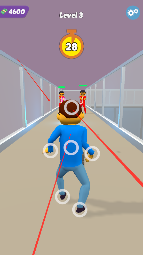 1、角色向前奔跑,前方會(huì)出現(xiàn)持槍敵人,我們要在限時(shí)的時(shí)間里,擺動(dòng)頭,手,腳,腰身四個(gè)部分,來躲避發(fā)射過來的子彈。