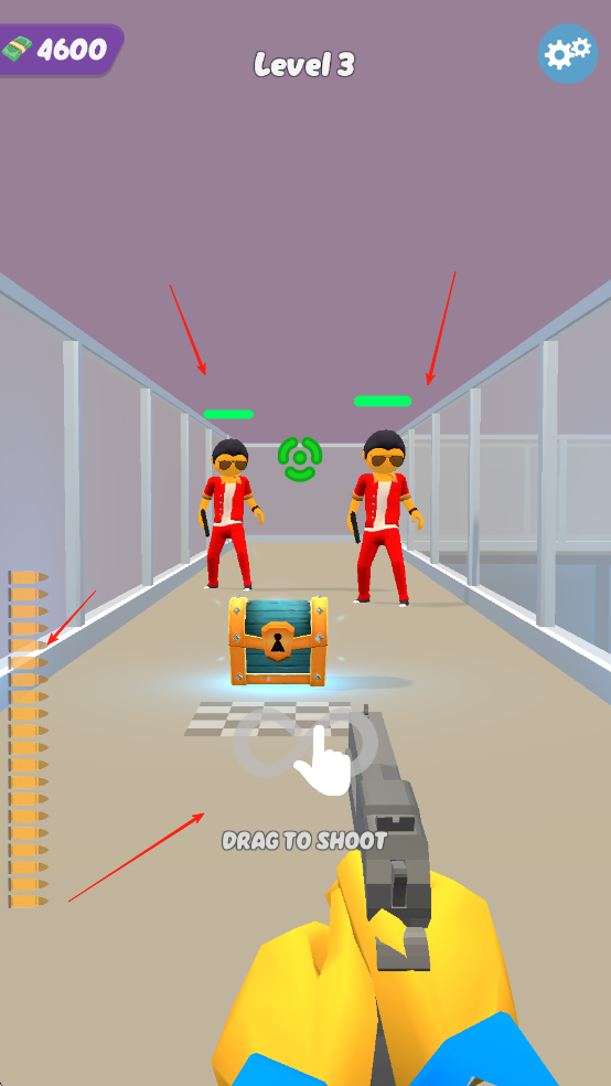 2、躲避完子彈后,我們就能拿著槍反擊,將綠色的準(zhǔn)心對(duì)準(zhǔn)敵人即可發(fā)射子彈,要注意子彈數(shù)量有限,在子彈用完前擊倒所有敵人。