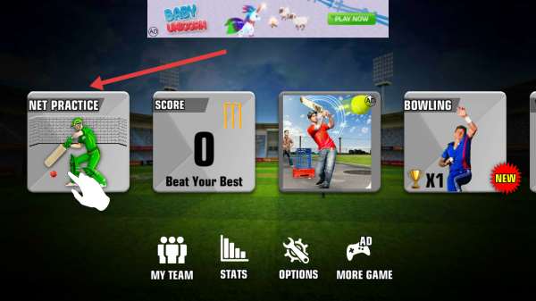 1、點(diǎn)擊啟動(dòng)頁板球START,進(jìn)主界面選NET PRACTICE,入體育場網(wǎng)式練習(xí),熟擊球,投球基礎(chǔ)。