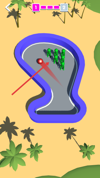 1、滑動著屏幕控制紅球滾動方向和距離,整齊的撞擊前方的小人,有序的各個擊破,清空場地。