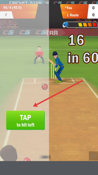 2、對局時緊盯投球軌跡,見TAP to hit left提示,快速點擊屏幕左側(cè),操控藍(lán)色擊球手向左擊球。