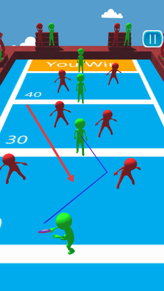 3、對(duì)戰(zhàn)時(shí)滑動(dòng)屏幕繪制飛盤(pán)軌跡,繞開(kāi)紅隊(duì)阻攔,借場(chǎng)地標(biāo)線(xiàn)預(yù)判落點(diǎn)投向得分區(qū),通關(guān)后解鎖新關(guān)卡,優(yōu)化路線(xiàn)積累勝場(chǎng)解鎖道具。