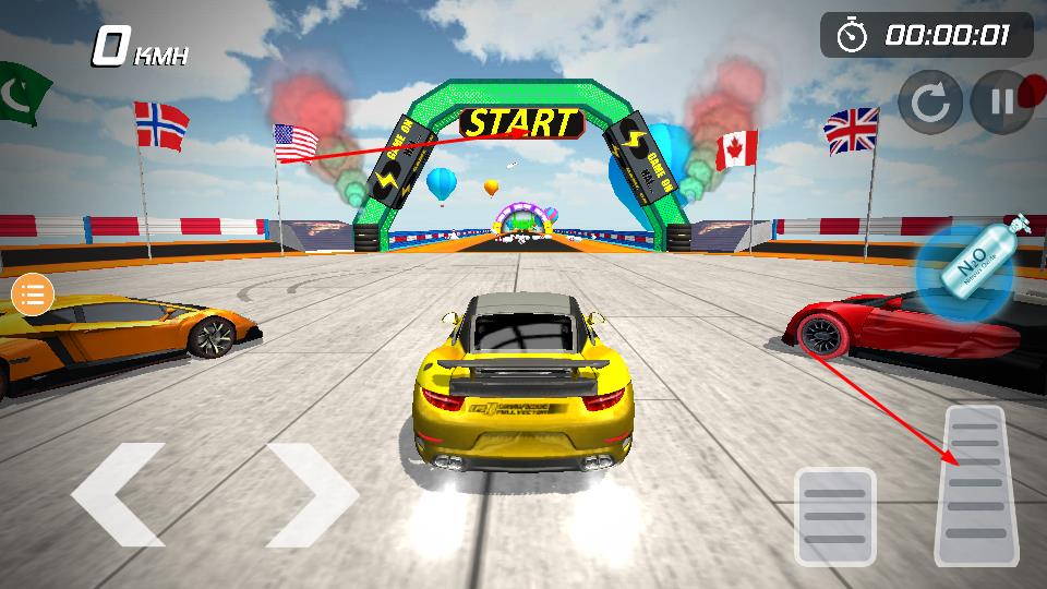 3、從START拱門出發(fā),穿越賽道障礙、飛躍坡道,以最短時(shí)間沖過終點(diǎn),積累成績(jī)解鎖更多賽車與特技賽道。