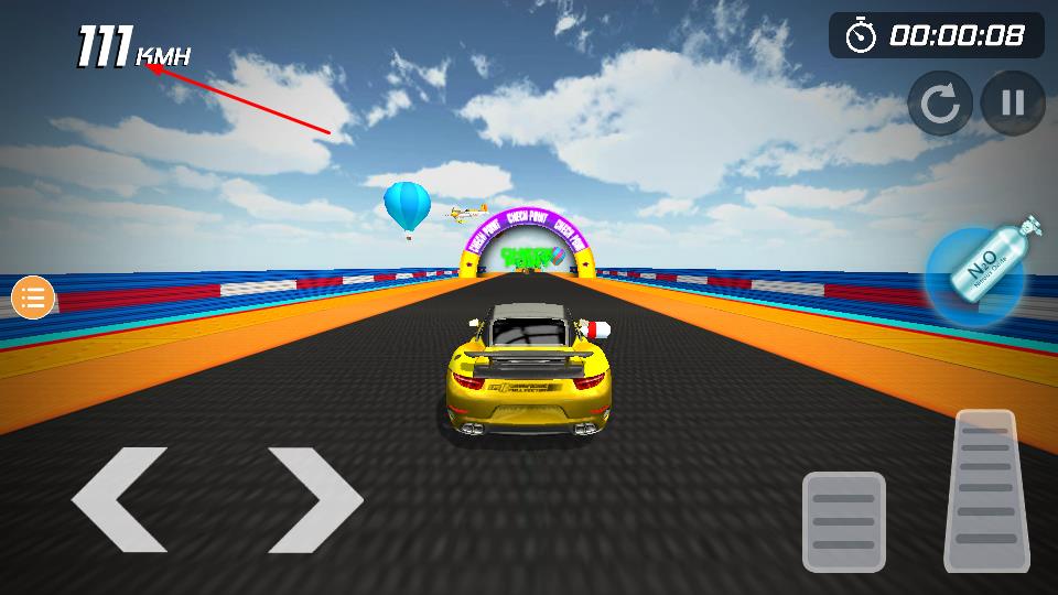 2、賽道內(nèi)左側(cè)方向鍵調(diào)控轉(zhuǎn)向,右側(cè)按鍵控制加速,留意左上角速度數(shù)值如111KMH,點(diǎn)擊右側(cè)氮?dú)馄繄D標(biāo),觸發(fā)短時(shí)加速,助力沖刺。