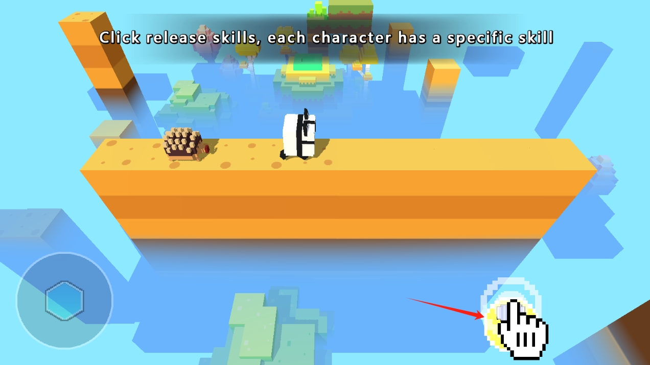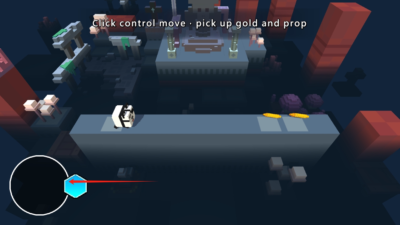 1、操作提示界面,撥動輪盤控制角色移動,在場景中靈活穿梭,拾取金幣和道具,為戰(zhàn)斗蓄力。