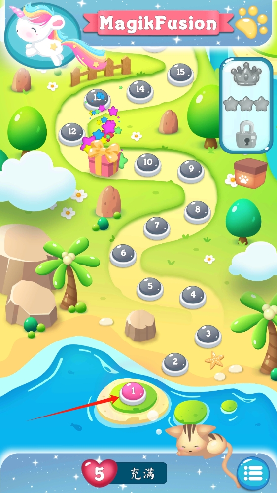 1、關(guān)卡選擇界面,點擊粉色按鈕,進入MagikFusion關(guān)卡1,開啟消除冒險。