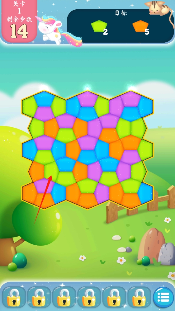 2、關(guān)卡1游戲界面,在14步內(nèi),巧妙消除2個綠色和5個橙色六邊形方塊,達成目標。