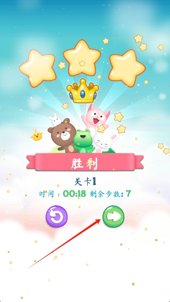 3、關(guān)卡勝利后,點擊綠色按鈕,進入下一關(guān),繼續(xù)消除挑戰(zhàn),爭取更好成績。