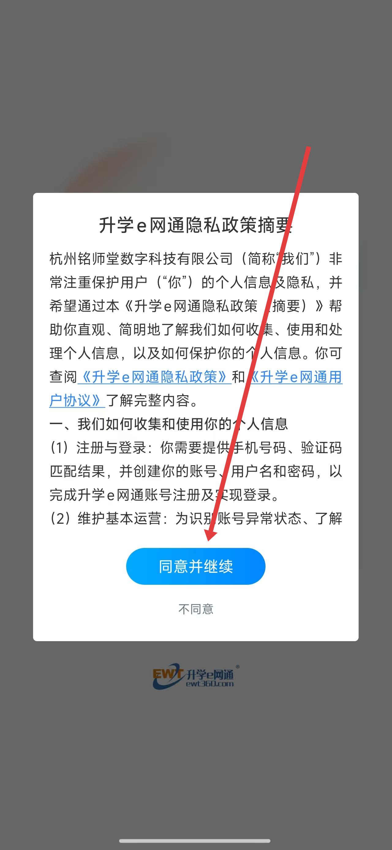 1、打開升學(xué)e網(wǎng)通后,通過點(diǎn)擊彈窗中的同意并繼續(xù)按鈕,進(jìn)入使用。