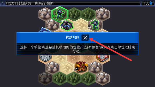 2、進入游戲后,關(guān)閉移動部隊的提示彈窗,查看戰(zhàn)場布局,選擇友方作戰(zhàn)單位,準(zhǔn)備執(zhí)行移動指令推進戰(zhàn)局。