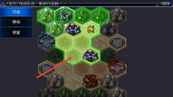 3、在戰(zhàn)斗界面,選定友方機械單位,點擊綠色高亮的目標(biāo)格子,讓單位移動至該位置,調(diào)整陣型,為后續(xù)攻防策略做準(zhǔn)備。