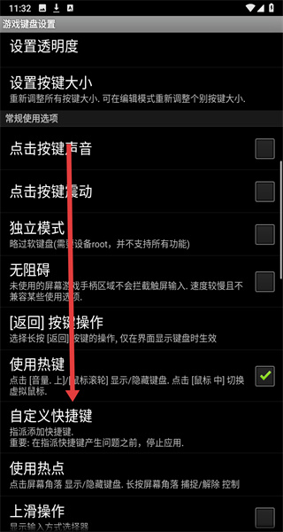 2、在進(jìn)入設(shè)置頁(yè)面中,通過(guò)下拉找到并點(diǎn)擊自定義快捷鍵選項(xiàng),進(jìn)入設(shè)置。
