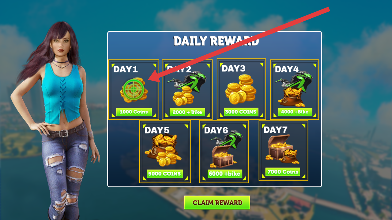 1、進(jìn)入每日獎(jiǎng)勵(lì)界面,點(diǎn)擊DAY1的區(qū)域,領(lǐng)取屬于今天的1000金幣,積累初始資源用于升級(jí)或解鎖道具。