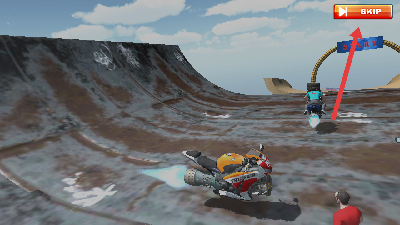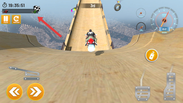 3、賽車過(guò)程中,需要時(shí)不時(shí)查看左上角的終點(diǎn)旗幟與對(duì)手的位置,操控摩托全力沖刺,爭(zhēng)取抵達(dá)終點(diǎn)并提升排名。