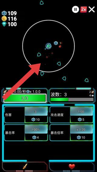 2、進(jìn)入到游戲場景內(nèi),顯示總波數(shù)為3,玩家需要攻擊3波敵人,可觀察傷害、攻擊速度以及暴擊率。