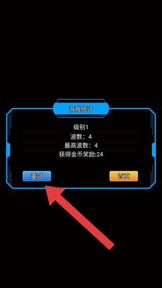3、畫面呈現(xiàn)了游戲結(jié)束后的統(tǒng)計,顯示本關(guān)已完成,獲得金幣獎勵:24,可點擊重試也可返回首頁繼續(xù)調(diào)整。