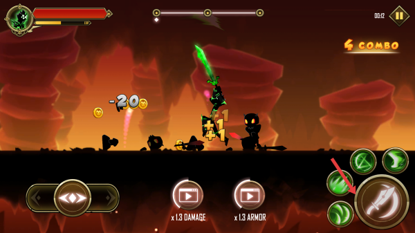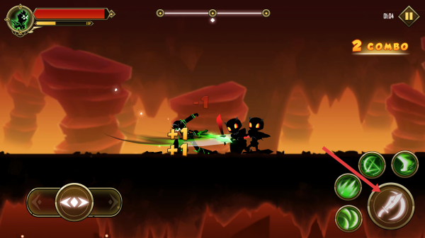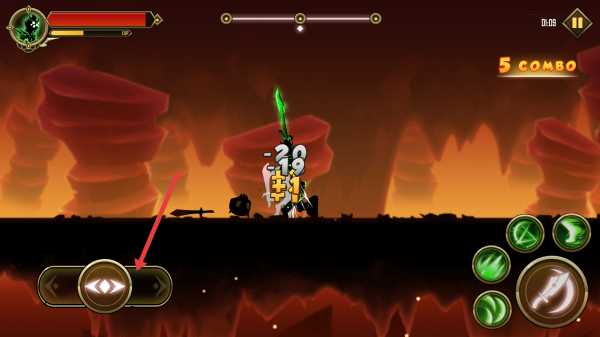 1、戰(zhàn)斗開始,點擊右側(cè)的攻擊按鈕,用綠色的劍氣攻擊敵人,觸發(fā)連擊,快速削減敵方血量。