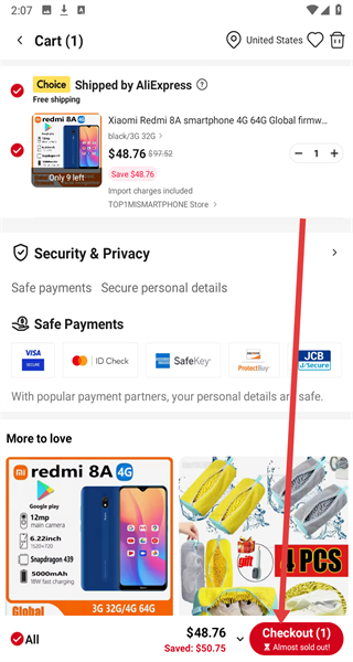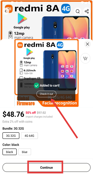 3、在選擇好手機(jī)型號(hào)后,點(diǎn)擊Continue按鈕進(jìn)行添加,再點(diǎn)擊Check it out按鈕即可跳轉(zhuǎn)到購(gòu)物車中。