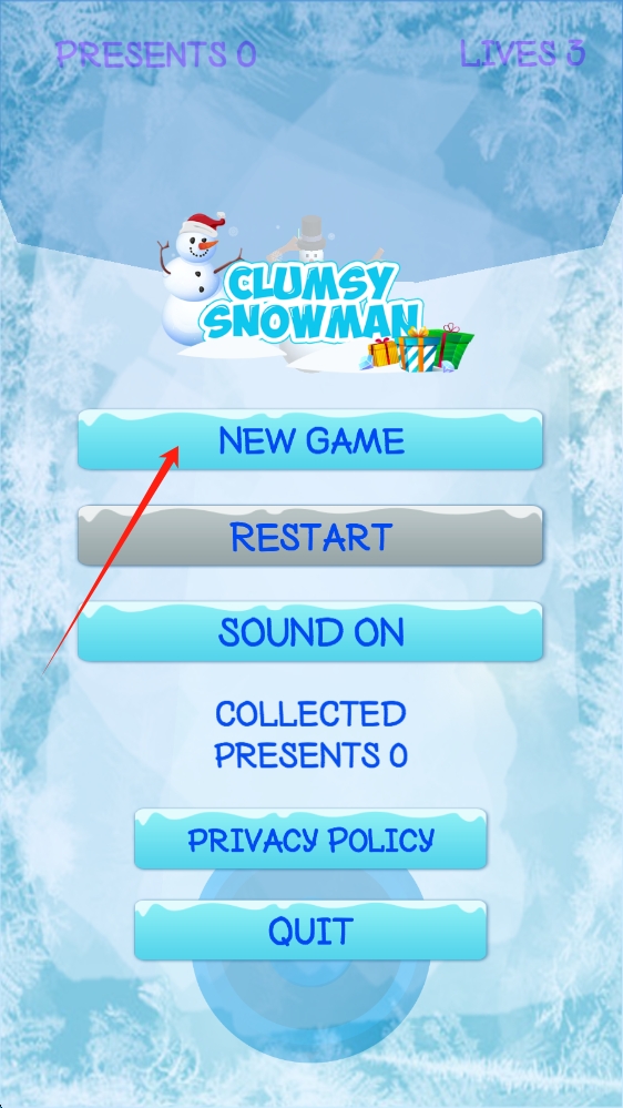 1、主界面,點(diǎn)擊NEW-GAME,開啟CLUMSY-SNOWMAN的冒險(xiǎn),點(diǎn)擊進(jìn)入到游戲當(dāng)中。