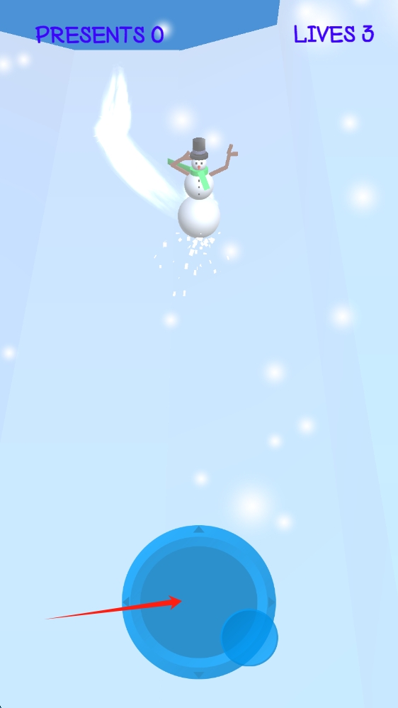 2、操作界面,在藍(lán)色圓盤區(qū)域,靈活操控雪人,躲避障礙,保持雪人移動(dòng),撥動(dòng)輪盤移動(dòng)。