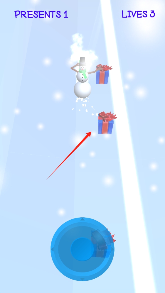3、收集界面,操控雪人,在圓盤區(qū)域收集禮物,完成收集任務(wù),提升游戲進(jìn)度,靠近拾取。