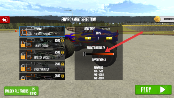 1、在環(huán)境選擇界面,確認賽道PINETREE SPRINT,調節(jié)SELECT DIFFICULTY難度條,查看對手數3人和獎勵。