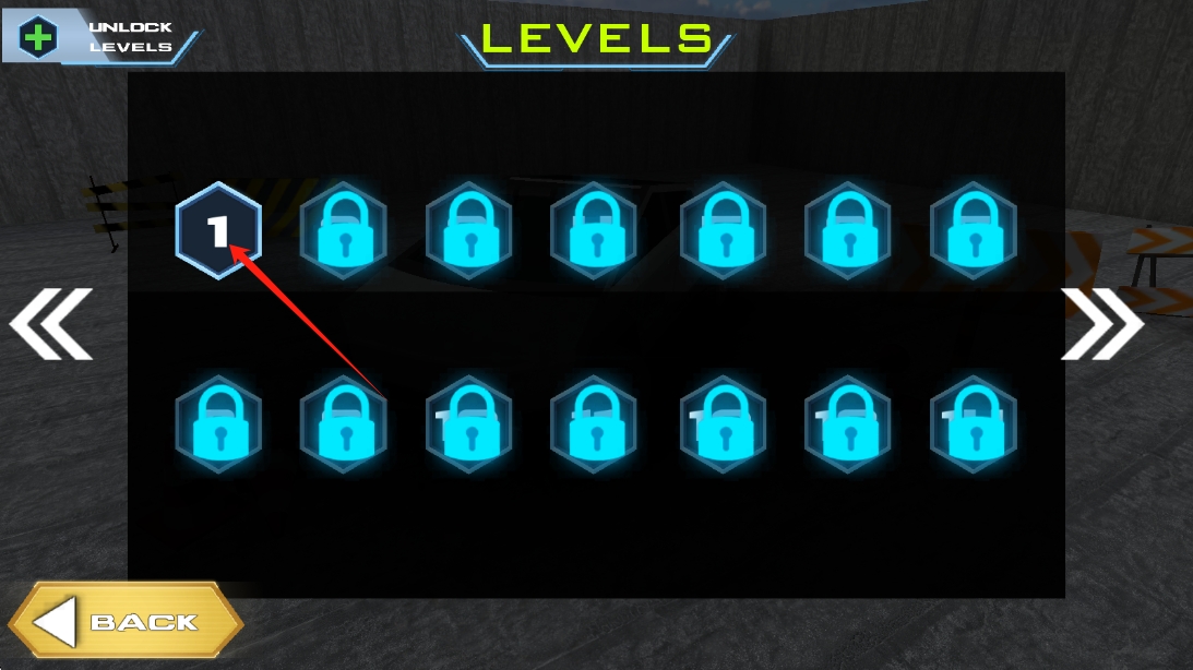 2、關(guān)卡選擇界面,點(diǎn)擊解鎖的關(guān)卡1,進(jìn)入游戲場景,準(zhǔn)備挑戰(zhàn)障礙賽道,點(diǎn)擊選擇關(guān)卡。