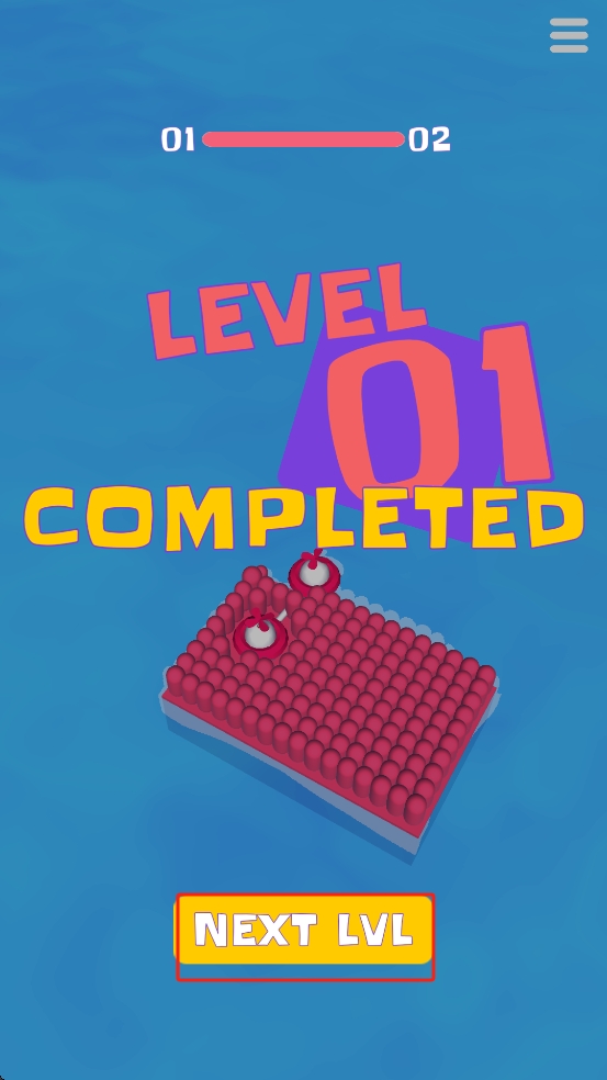 3、關(guān)卡完成后,點(diǎn)擊下方按鈕進(jìn)入下一關(guān),新關(guān)卡會有更復(fù)雜的白色小球矩陣布局,需繼續(xù)優(yōu)化紅色覆蓋和圓片滾動策略。