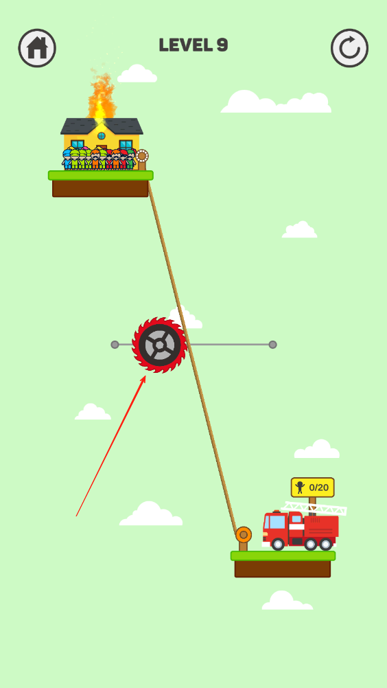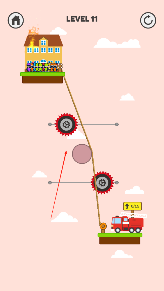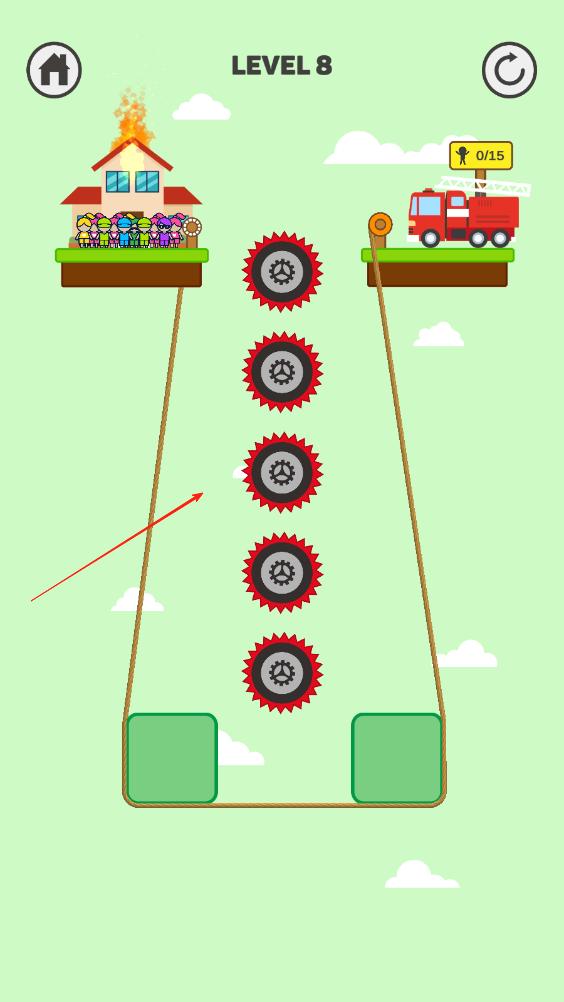1、繩索兩點雖然很近,但齒輪在中間擋著會危害被困人員姓名,我們需要向途中這樣連接兩個點,然后點擊屏幕讓被困人員獲救。