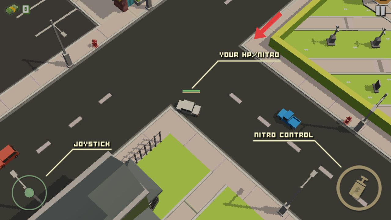 1、熟悉界面操作,通過左側(cè)JOYSTICK搖桿控制車輛移動(dòng),關(guān)注上方Y(jié)OUR HP/NITRO狀態(tài),右側(cè)氮?dú)獍存I按需啟用。