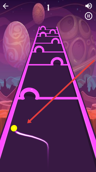 2、游戲中滑動屏幕控制黃色小球移動,沿粉色跑道前進,躲避障礙,盡可能跑得更遠以提升分數(shù)。