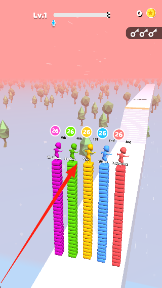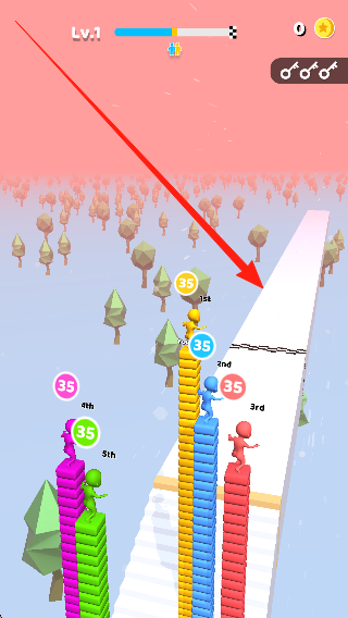 2、在走樓梯過程中積極收集同色磚塊,完成搭建任務(wù),同時向遇到的對手發(fā)起進攻,逐步推進挑戰(zhàn)進度。