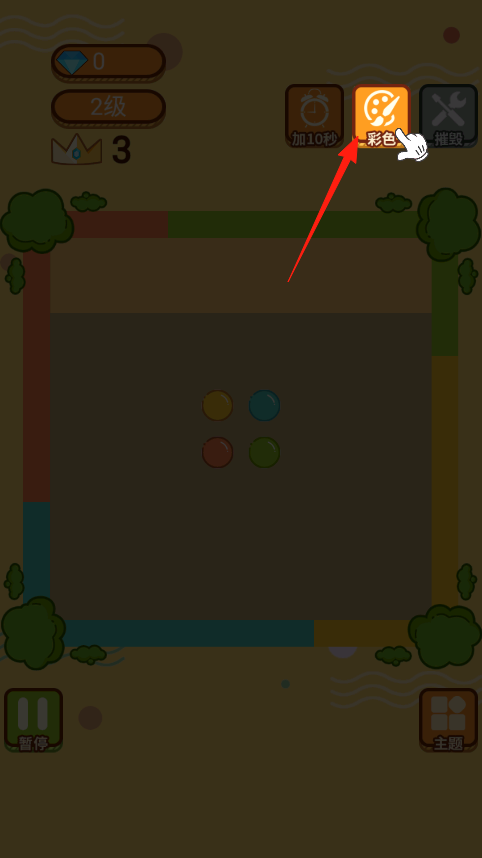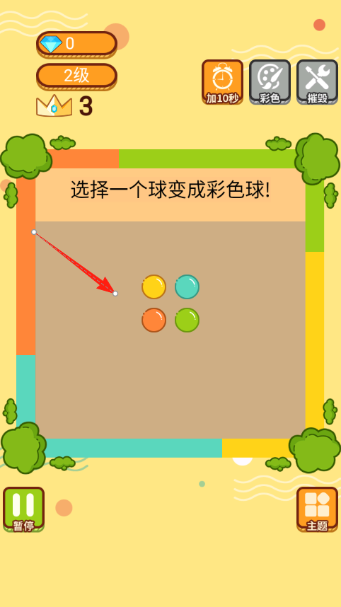 3、用了彩色道具后,屏幕提示選一個球變彩色,挑一個顏色難湊的球,點它變成彩色,這樣就能和其他同色球連線消除,靠道具助力,解決連線難題,繼續(xù)闖關。