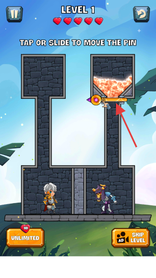 1、在Level 1,點(diǎn)擊或滑動(dòng)移除插銷(xiāo),引導(dǎo)熔巖流動(dòng),幫助角色避開(kāi)危險(xiǎn),推進(jìn)關(guān)卡。