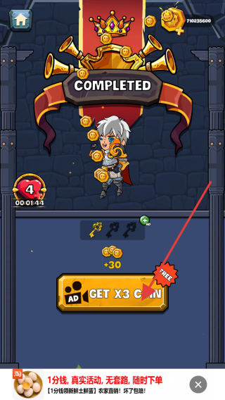 3、關(guān)卡完成后,點(diǎn)擊GET X3 COIN看廣告翻倍領(lǐng)金幣,積累資源提升角色能力。