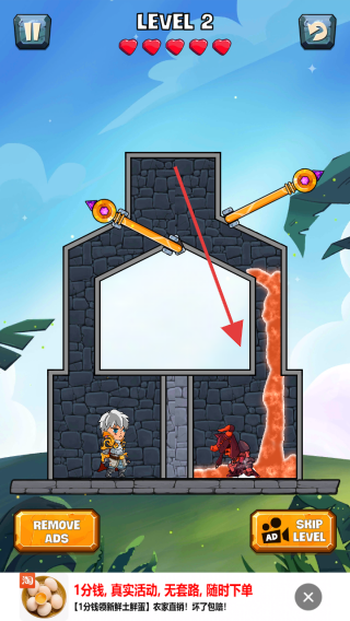 2、Level 2時(shí),觀察熔巖和插銷(xiāo)布局,合理操作插銷(xiāo),讓熔巖消滅敵人,為角色開(kāi)路。
