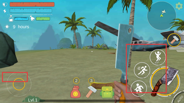 1、在游戲初始場景,利用右側(cè)跳躍、疾跑等動作按鈕,操控角色移動,熟悉基礎(chǔ)操作,應(yīng)對海島環(huán)境。