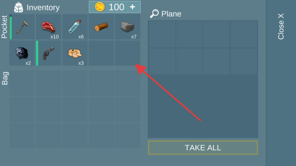 3、打開飛機 inventory 后,查看左側(cè)背包物資,按需點擊TAKE ALL或單個拾取,收集資源強化生存能力。