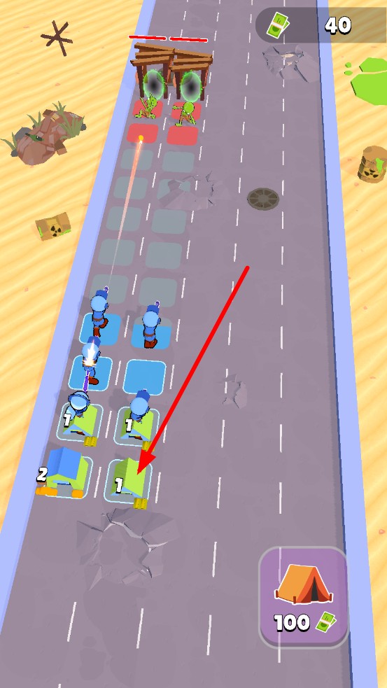 1、進(jìn)入關(guān)卡,消耗金幣,在公路空格部署炮塔,進(jìn)行防御,炮塔中出現(xiàn)士兵,對戰(zhàn)敵人的士兵。