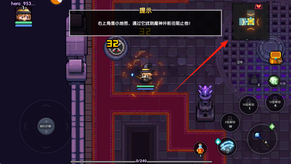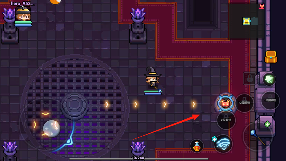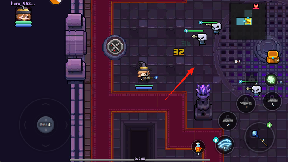 1、控制巫師角色,按箭頭指引方向移動,右側(cè)技能欄釋放攻擊如火焰技能。