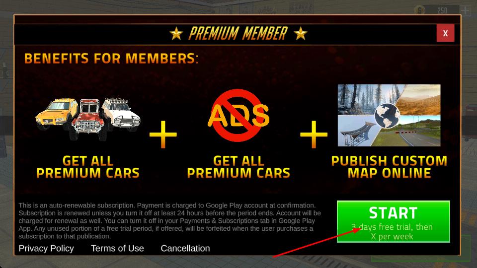 1、點(diǎn)擊START按鈕,可享3天免費(fèi)試用會(huì)員服務(wù),訂閱后獲取全部高級車輛、免廣告權(quán)益,還能在線發(fā)布自定義地圖,需留意自動(dòng)續(xù)費(fèi)規(guī)則提前24小時(shí)關(guān)閉可終止續(xù)費(fèi)。