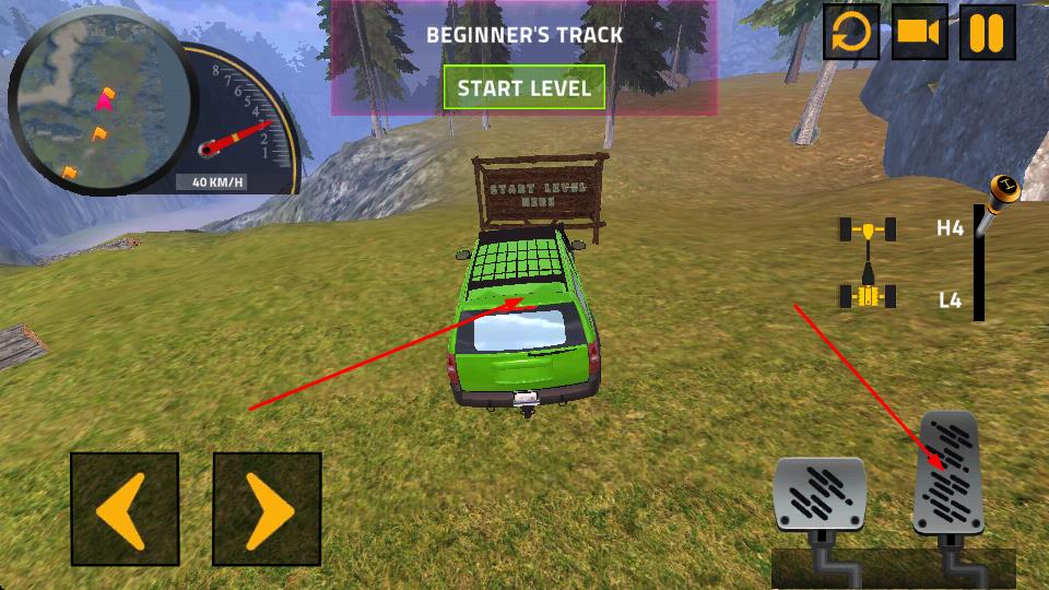 2、進(jìn)入BEGINNER'S TRACK關(guān)卡,點(diǎn)擊START LEVEL啟動(dòng)游戲,界面左側(cè)為方向控制鍵,右側(cè)是油門踏板,右上角可切換H4/L4驅(qū)動(dòng)模式,左上角地圖與時(shí)速表輔助駕駛決策。