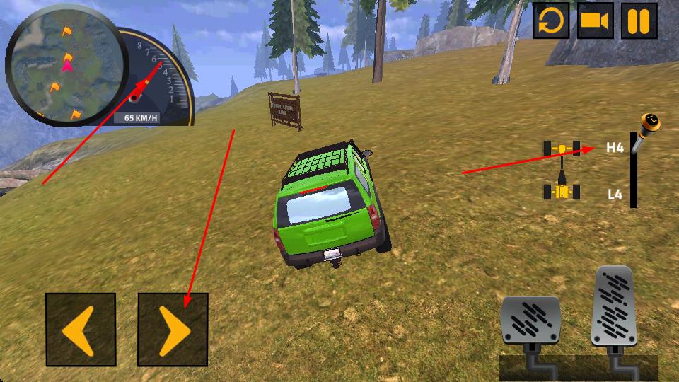 3、駕駛時(shí),通過方向鍵操控轉(zhuǎn)向,踩油門提升車速,依據(jù)地形切換驅(qū)動(dòng)模式如爬坡選L4、平路用H4,觀察時(shí)速表與地圖,順利完成越野賽道挑戰(zhàn)。