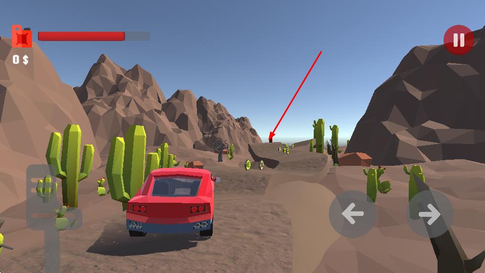 2、游戲中通過(guò)左右箭頭按鍵操控方向,驅(qū)動(dòng)汽車(chē)在沙漠地形爬坡,留意左上角燃油余量,收集沿途金幣。